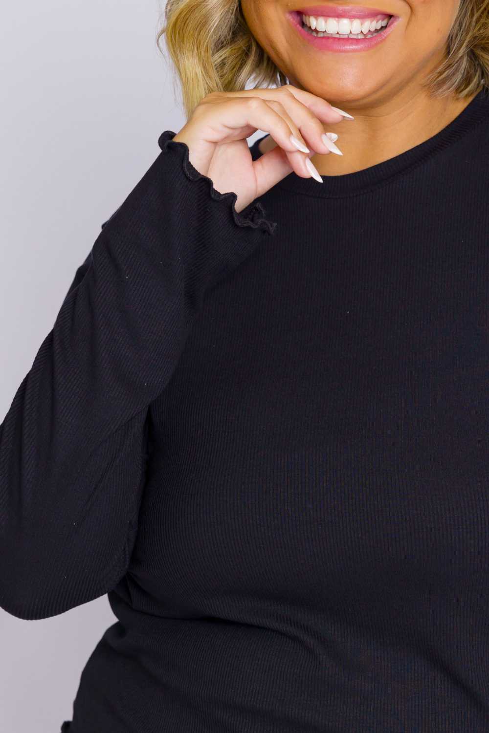 Suas mangas longas possuem um detalhe de acabamento fru fru delicado, adicionando um toque de charme único.