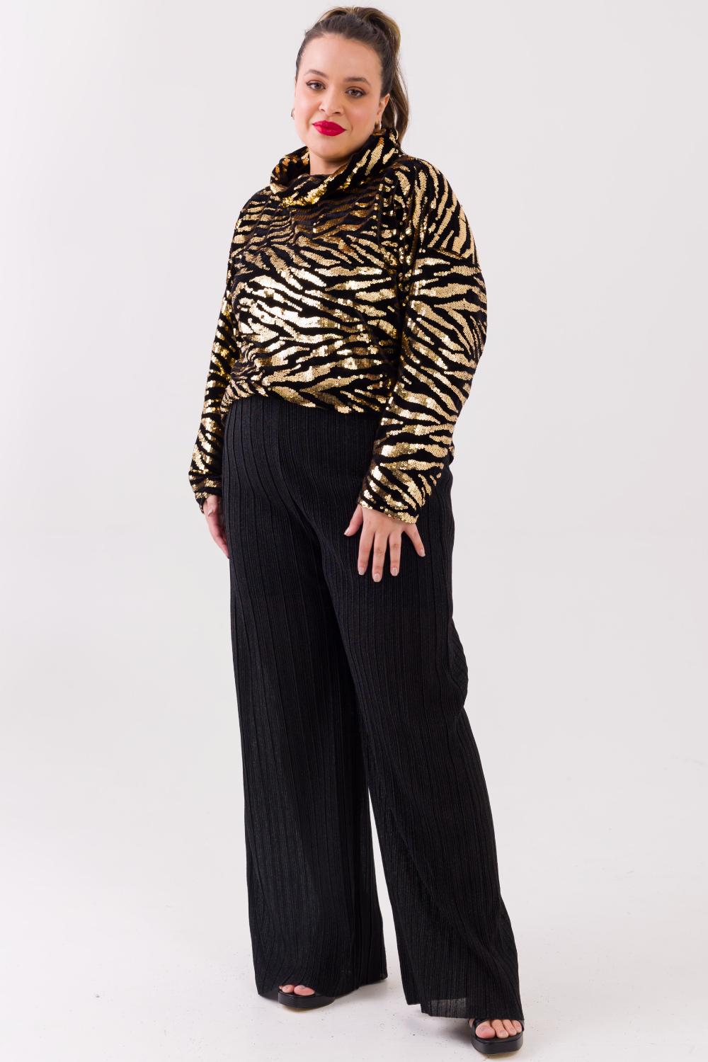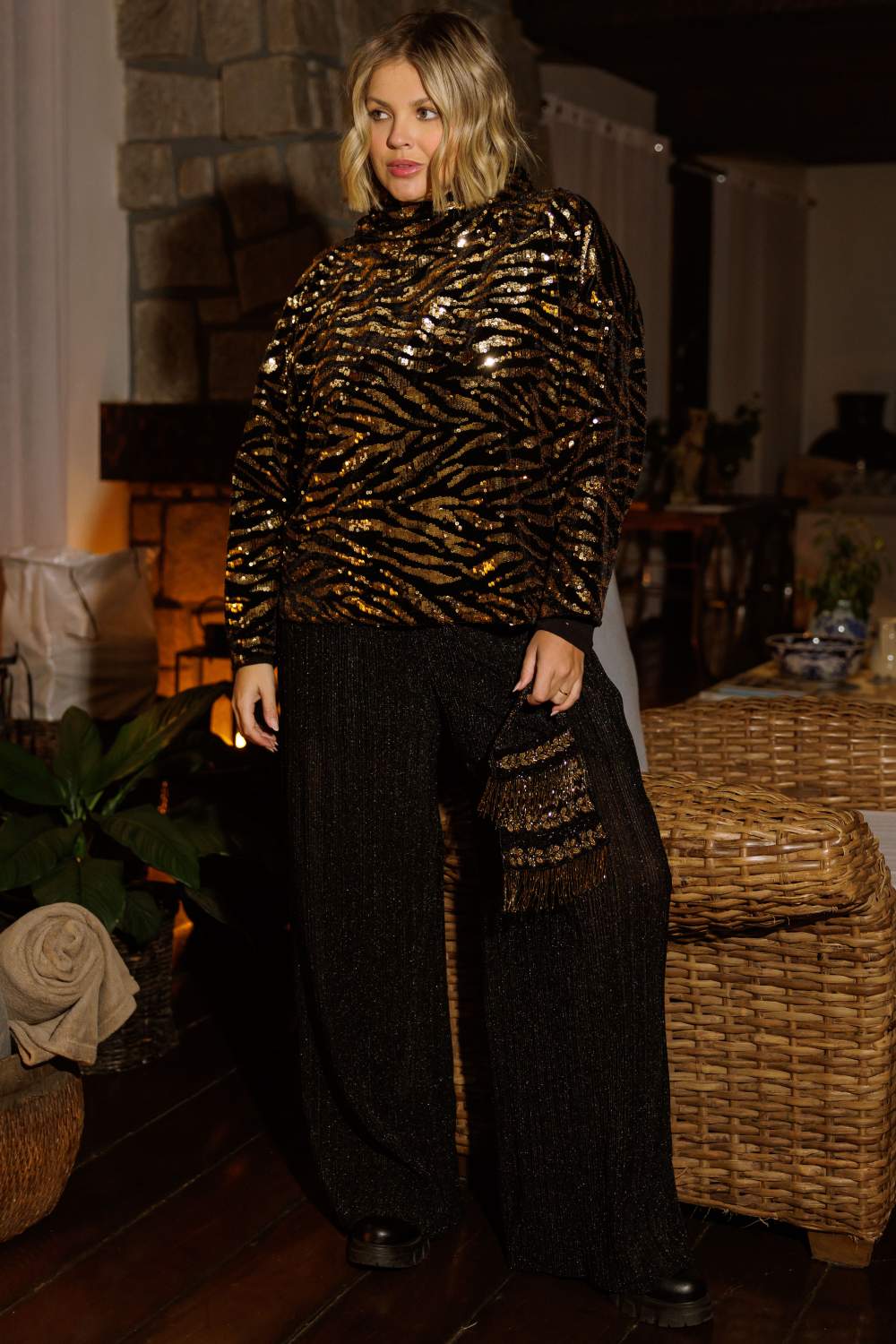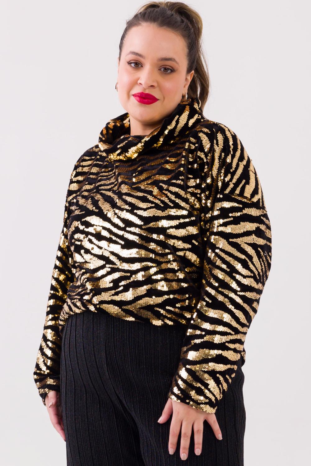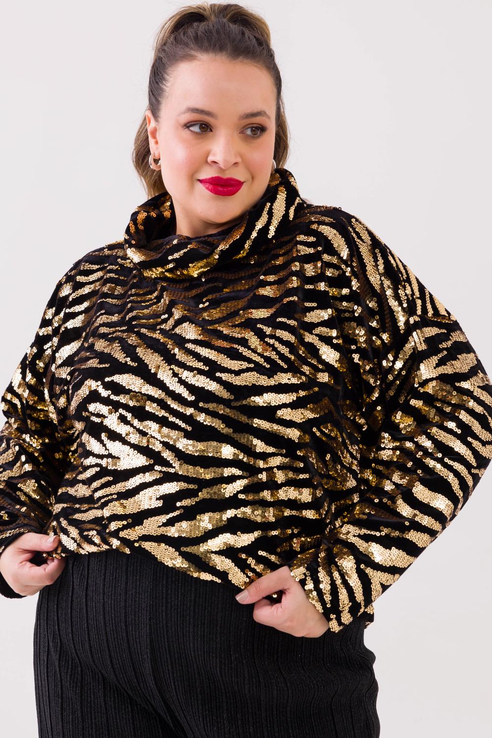 Seguindo a tendência glam que mistura versatilidade e ousadia, essa blusa manga longa é confeccionada em veludo com aplicações em paetê que seguem desenho de oncinha.