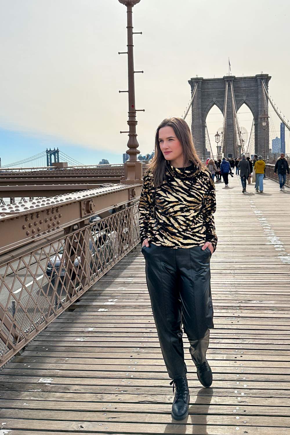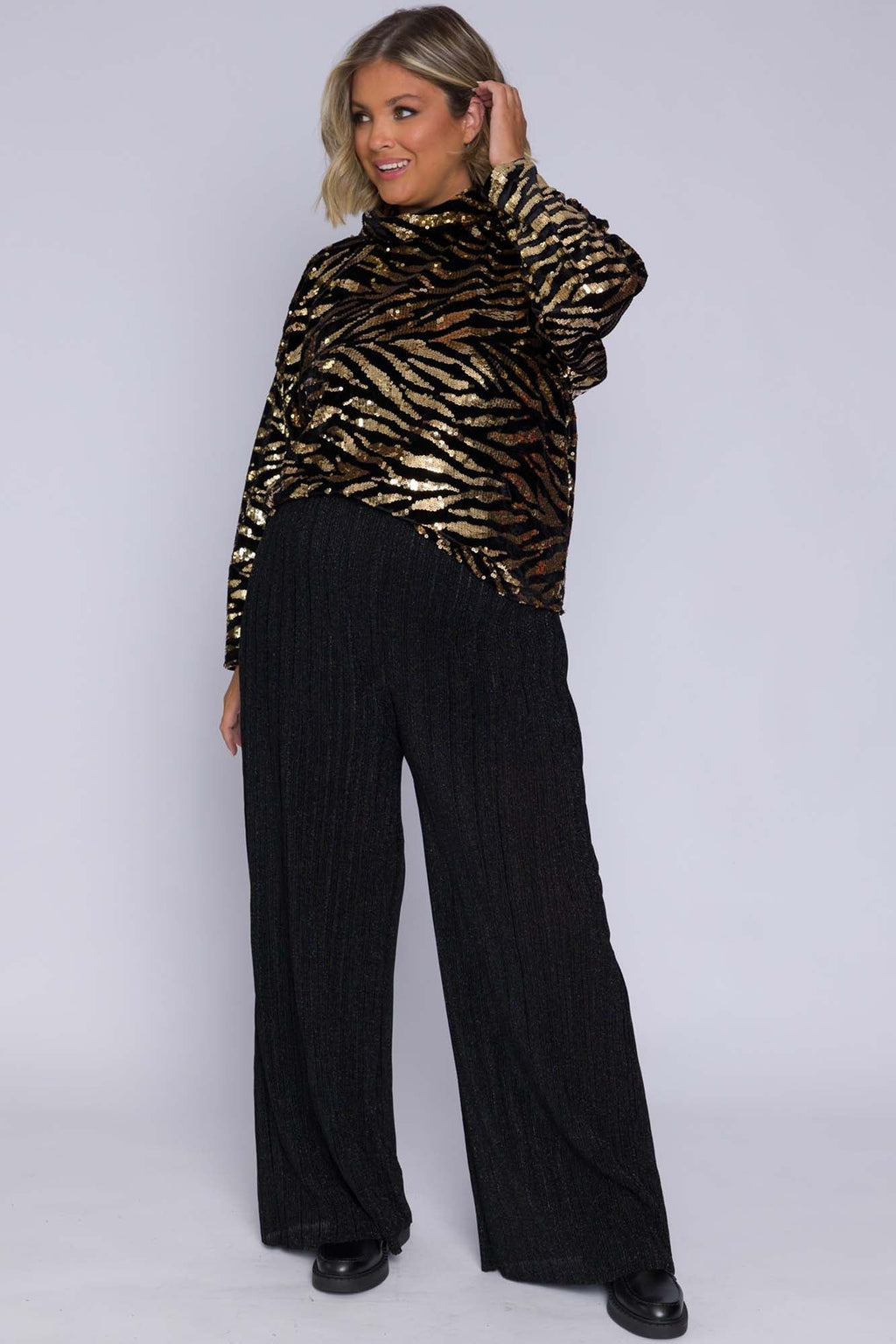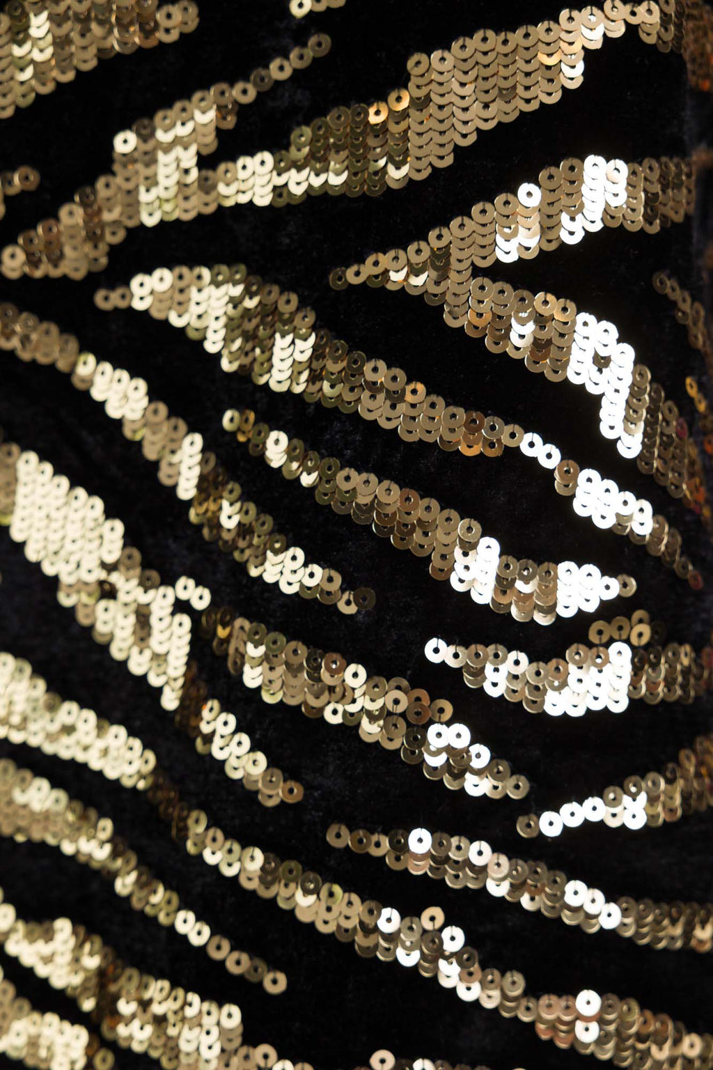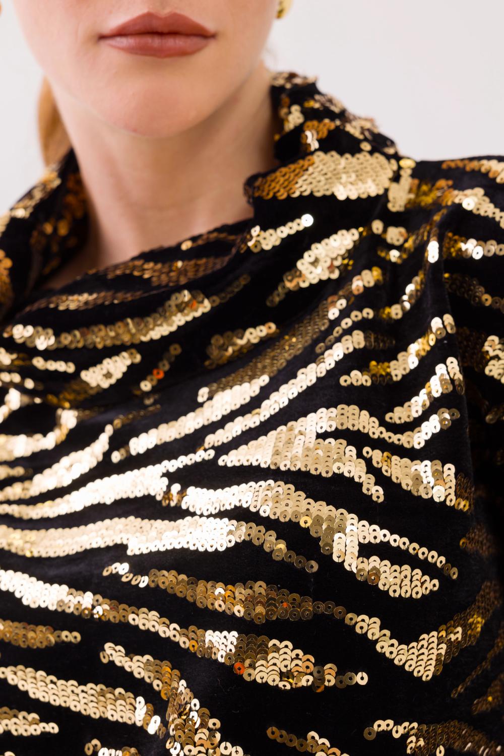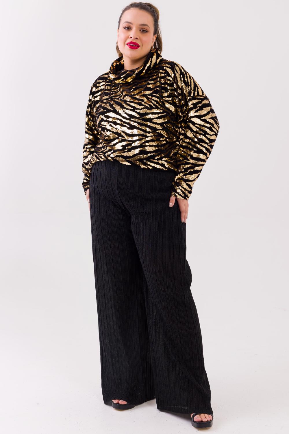 Seguindo a tendência glam que mistura versatilidade e ousadia, essa blusa manga longa é confeccionada em veludo com aplicações em paetê que seguem desenho de oncinha.