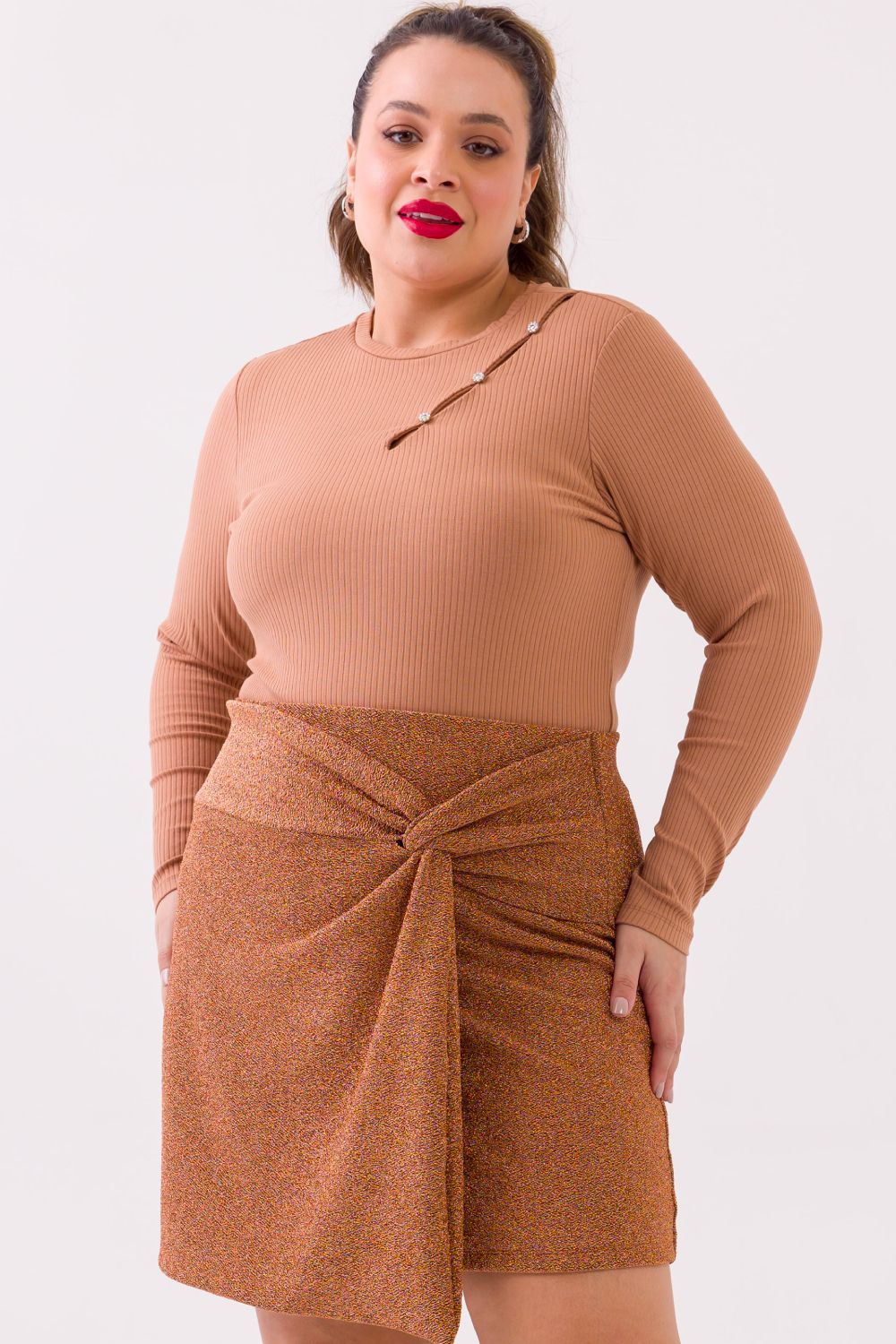 A modelagem justa ao corpo realça suas curvas de forma sutil e elegante, enquanto o detalhe decorativo com brilho e pequenas aberturas acrescentam um toque de glamour discreto, perfeito para qualquer ocasião.