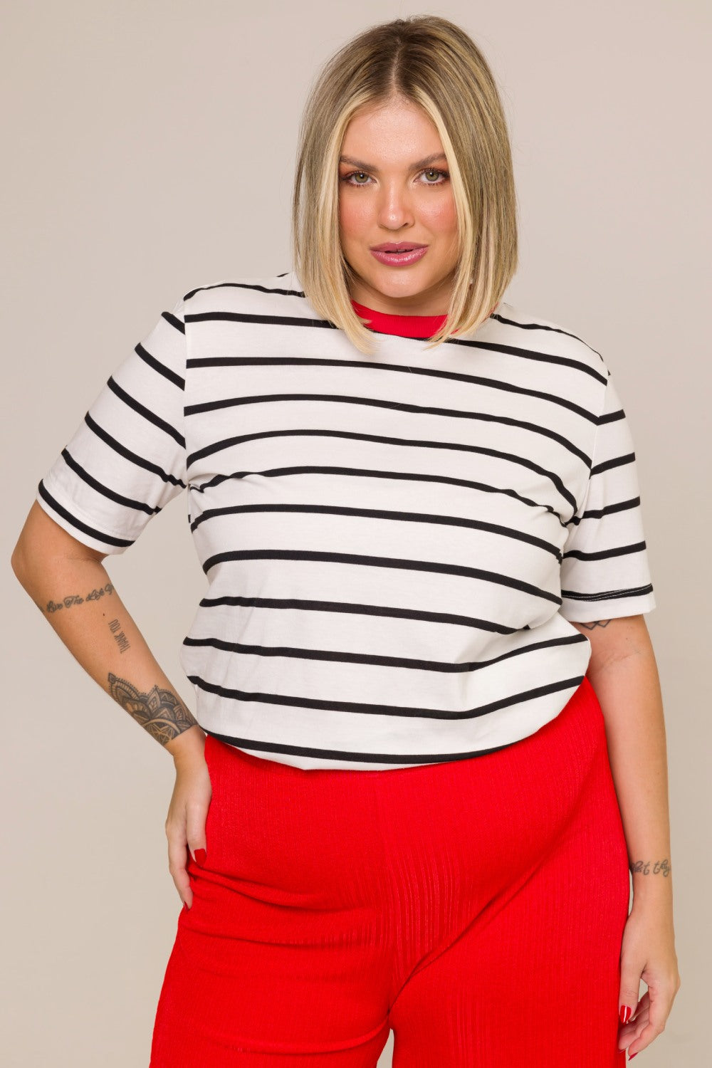 A t-shirt Sandra, produzida em meia malha, é a escolha perfeita para quem busca um visual casual e com um toque de cor. Com um tecido leve e respirável a peça possui estampa de listras clássicas, que traz um ar moderno e versátil ao look e proporciona combinações fáceis com diferentes estilos e peças do seu guarda-roupa.