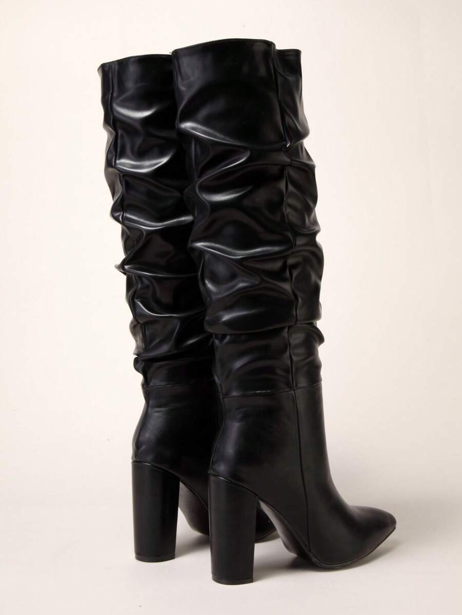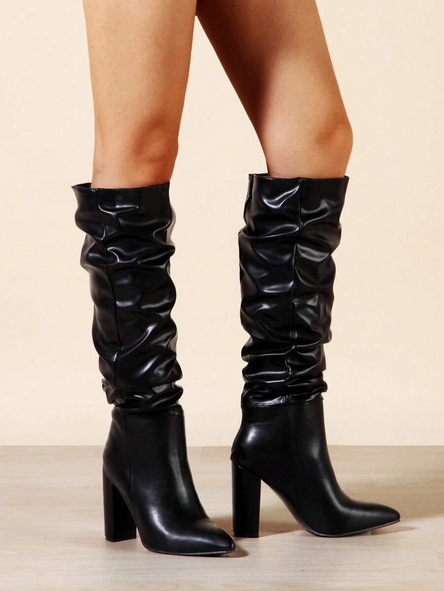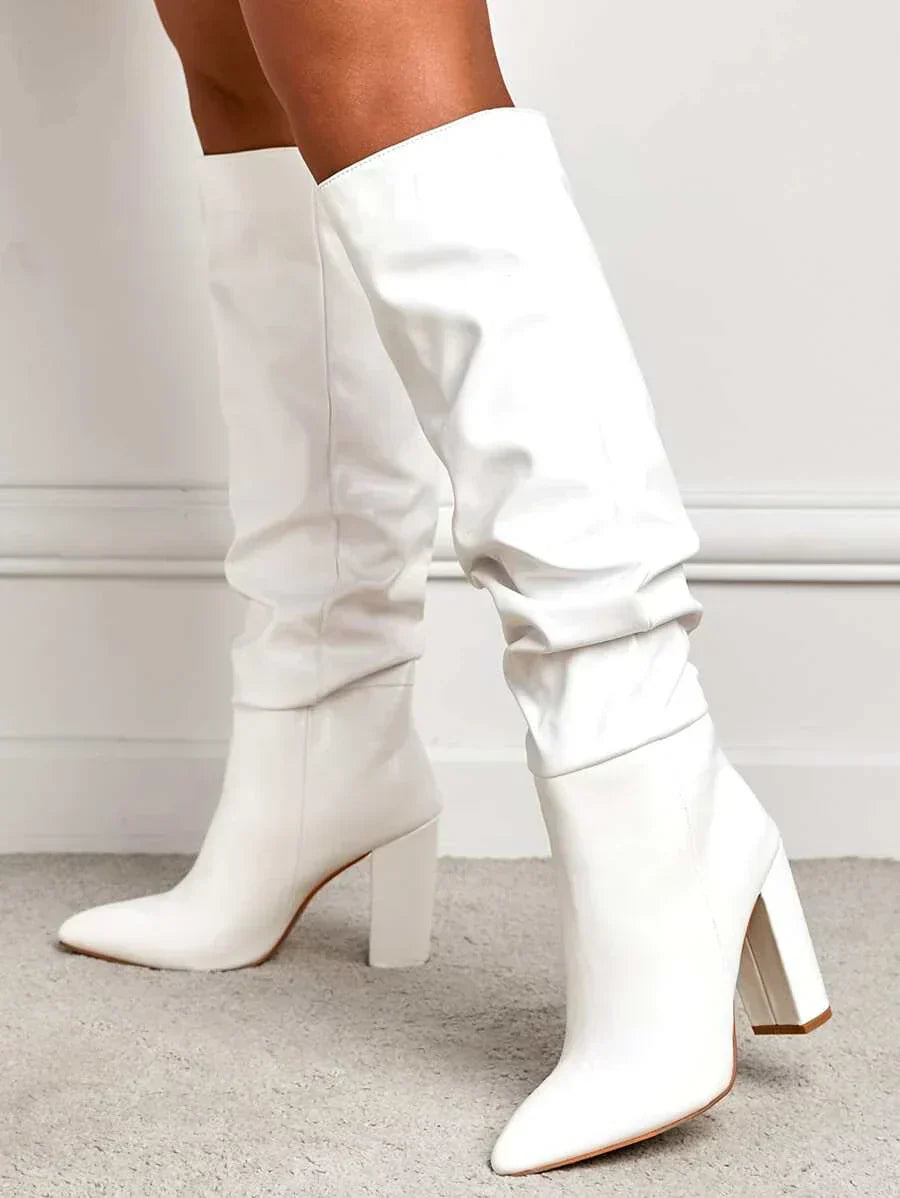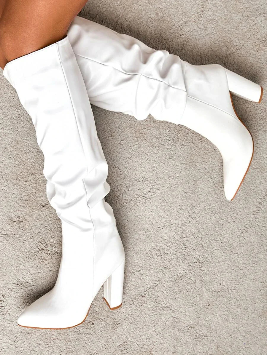 Descrição Tipo de Fechamento: Slip on Tipo: Botas desleixadas Cor: Branco , Preto Estampa: Simples Altura do salto: Salto alto Dedo do Pé: Sapato de bico fino Salto: Chunky Tipo de altura das botas: Botas de Joelho Estilo: Elegante Material da parte superior do calçado: Couro PU Material de revestimento: Couro PU Material da palmilha: Licra Material da Sola: Borracha