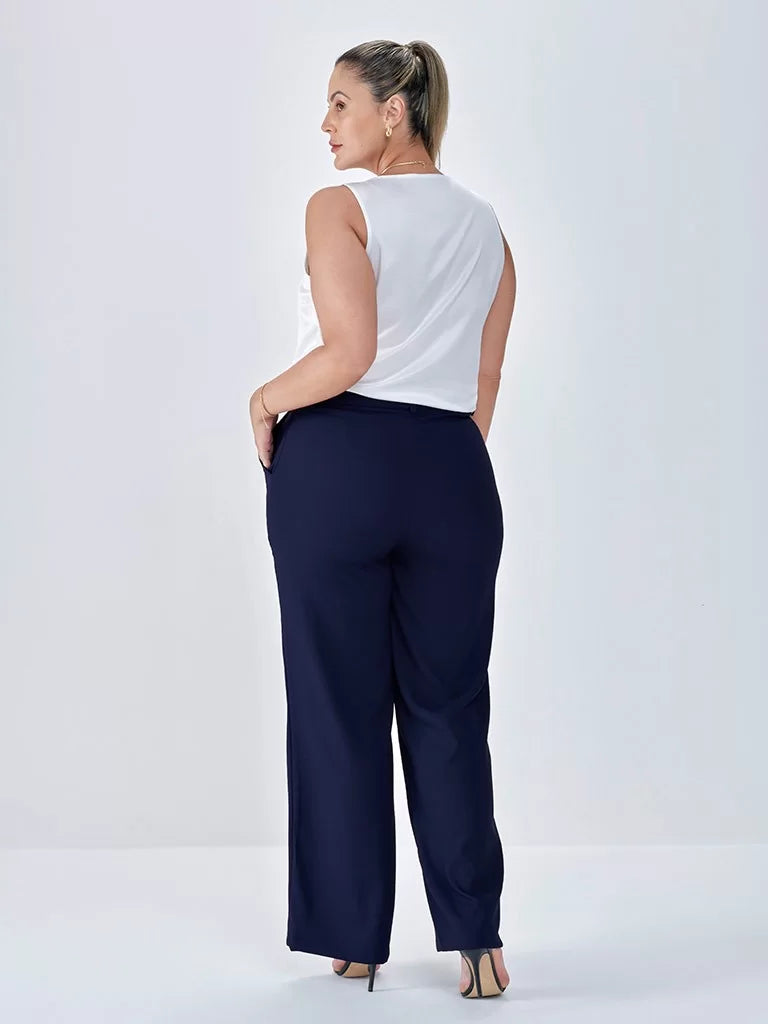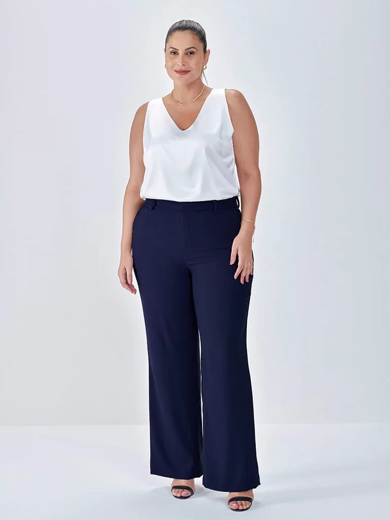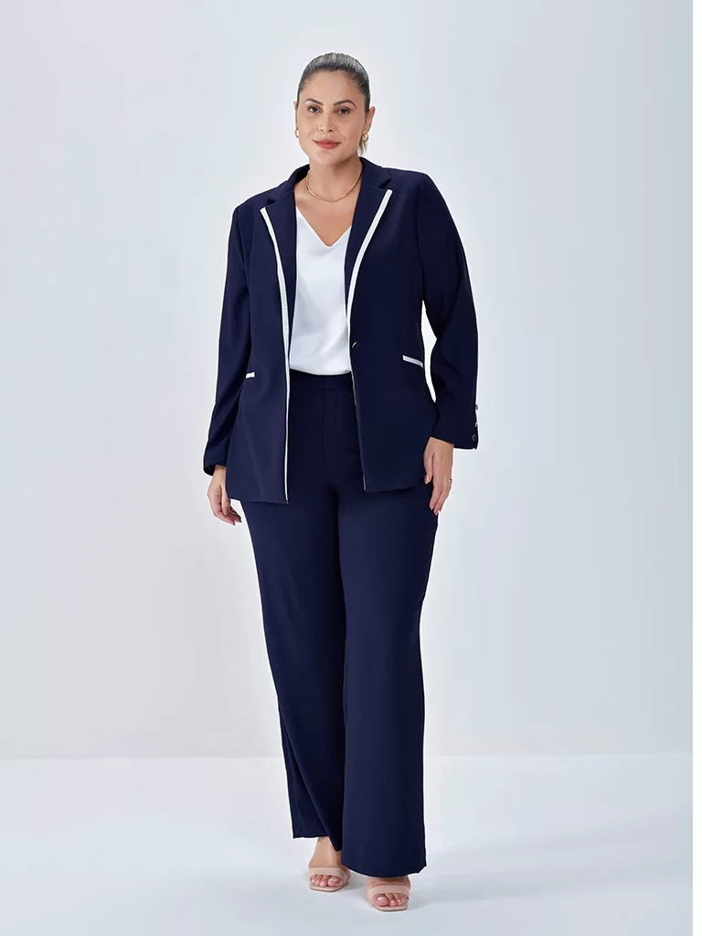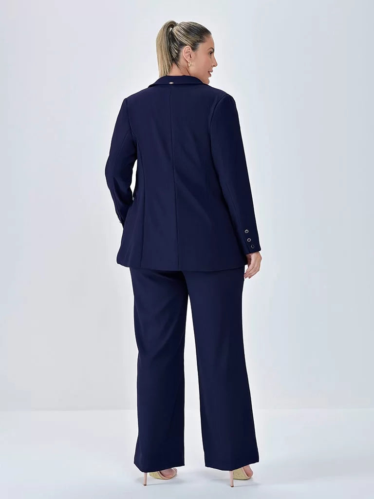 O Terninho de Alfaiataria Marinho é composto por um Blazer Alongado e uma Calça Wide Leg, ambos confeccionados em tecido Plano de Alfaiataria, com caimento fluído e toque inconfundível. O Blazer acompanha sofisticados Filetes em Off White, fechamento por botão em resina marinho com borda dourada e ombreiras. A Calça Wide Leg de Alfaiataria conta com cintura alta, bolso faca funcional e fechamento por caseado e um botão transparente interno.