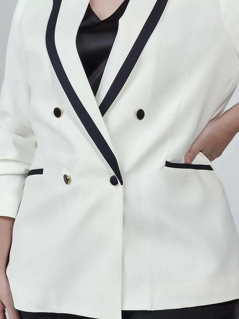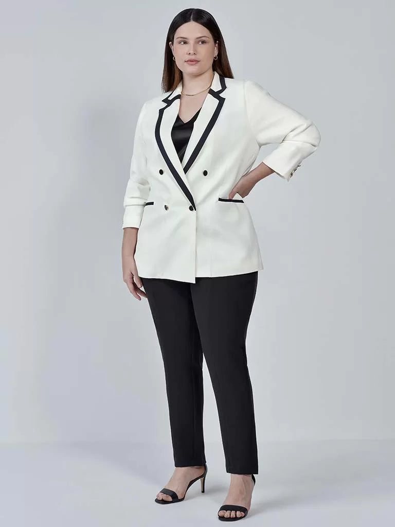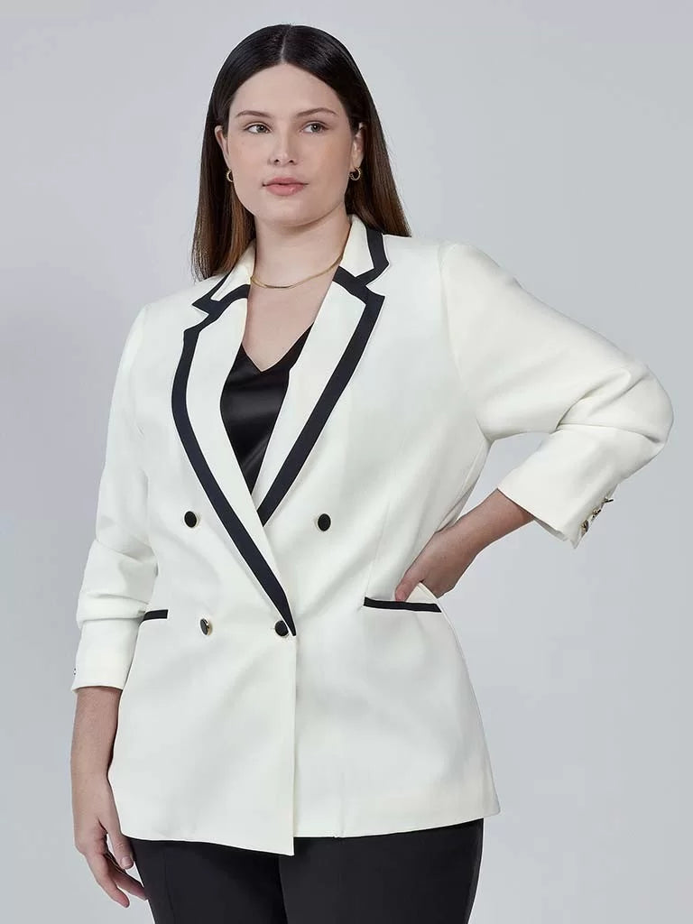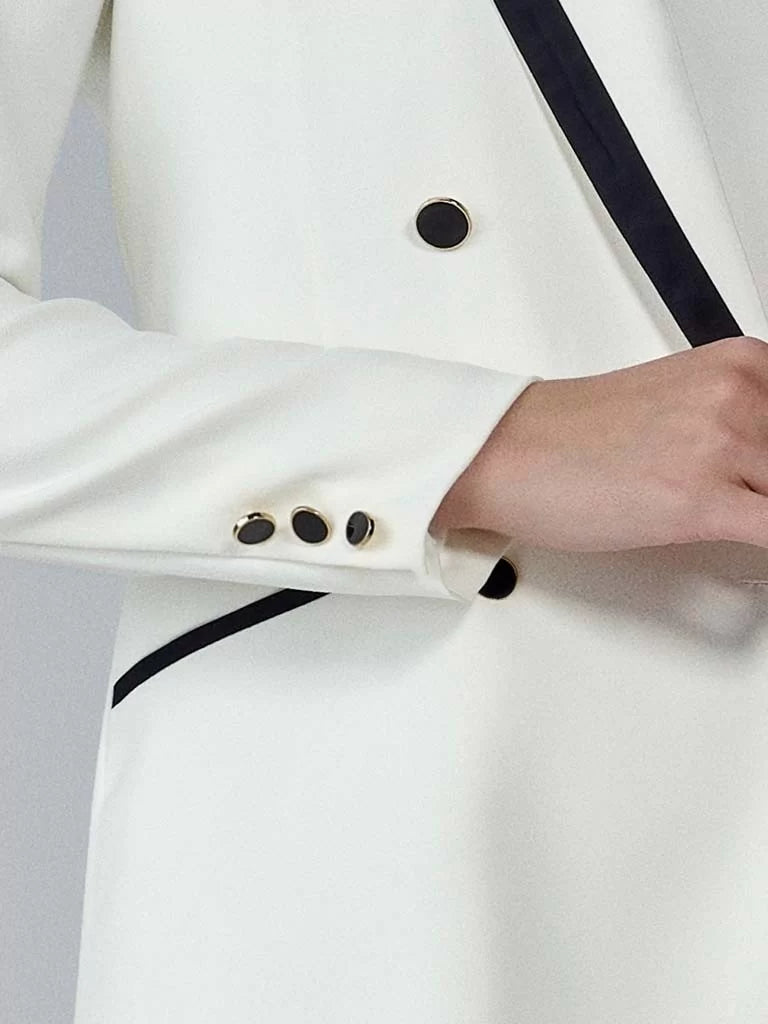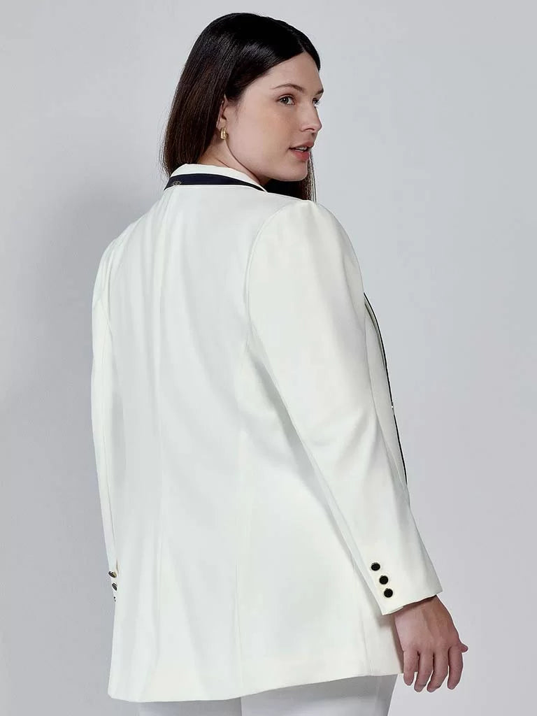 O Terninho de Alfaiataria Marinho é composto por um Blazer Alongado e uma Calça Wide Leg, ambos confeccionados em tecido Plano de Alfaiataria, com caimento fluído e toque inconfundível. O Blazer acompanha sofisticados Filetes em Off White, fechamento por botão em resina marinho com borda dourada e ombreiras. A Calça Wide Leg de Alfaiataria conta com cintura alta, bolso faca funcional e fechamento por caseado e um botão transparente interno.
