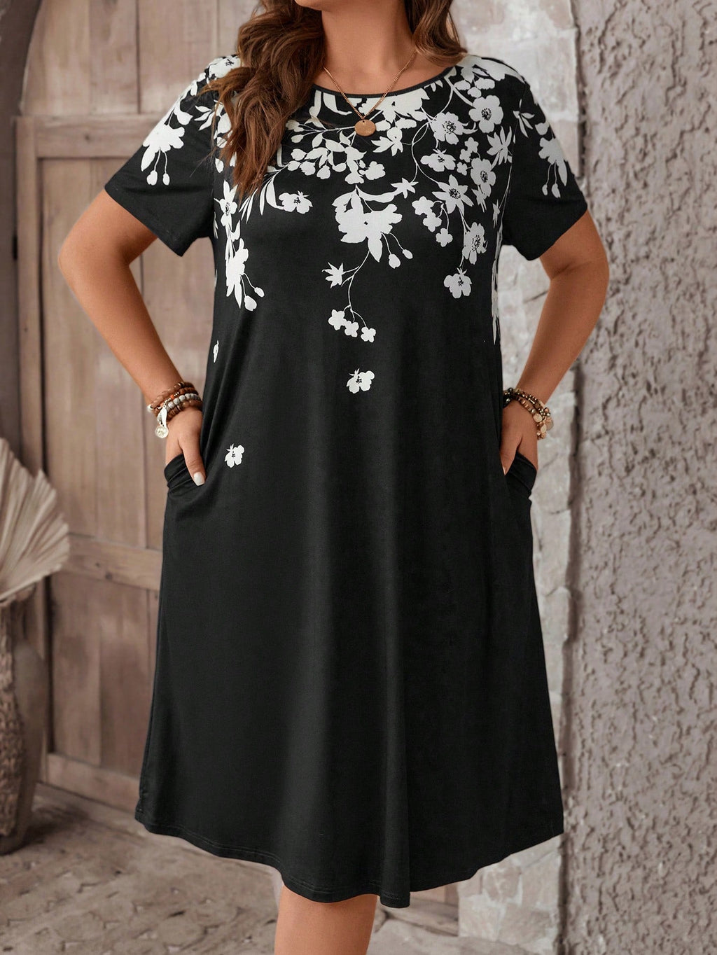 Estilo: Casual Linha da cintura: Natural Detalhes: Bolso Gola: Gola Redonda Forma da bainha: Reto Tipo: Camiseta Tipo de manga: Manga Regular Cor: Azul Marinho Estampa: Floral Comprimento da Manga: Manga Curta Comprimento: Comprimento de Joelho Caimento da peça: Ajuste Regular Tecido: Elasticidade Média Material: Tecido de malha Composição: 91% Poliéster Composição: 9% Elastano Instruções de manutenção: Lavar à máquina, não lavar a seco, lavar com detergente suave Translúcido: Não