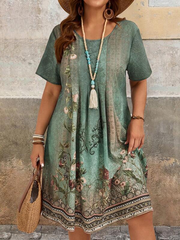 Estilo: Boho Linha da cintura: Natural Gola: Gola Redonda Forma da bainha: Reto Tipo: Túnica Tipo de manga: Manga Regular Cor: Verde Estampa: Floral Estampa: Plantas Comprimento da Manga: Manga Curta Comprimento: Comprimento de Joelho Caimento da peça: Solto Tecido: Não elástico Material: Tecido Composição: 97% Poliéster Composição: 3% Elastano Instruções de manutenção: Lavar à máquina, não lavar a seco, lavar com detergente suave Translúcido: Não