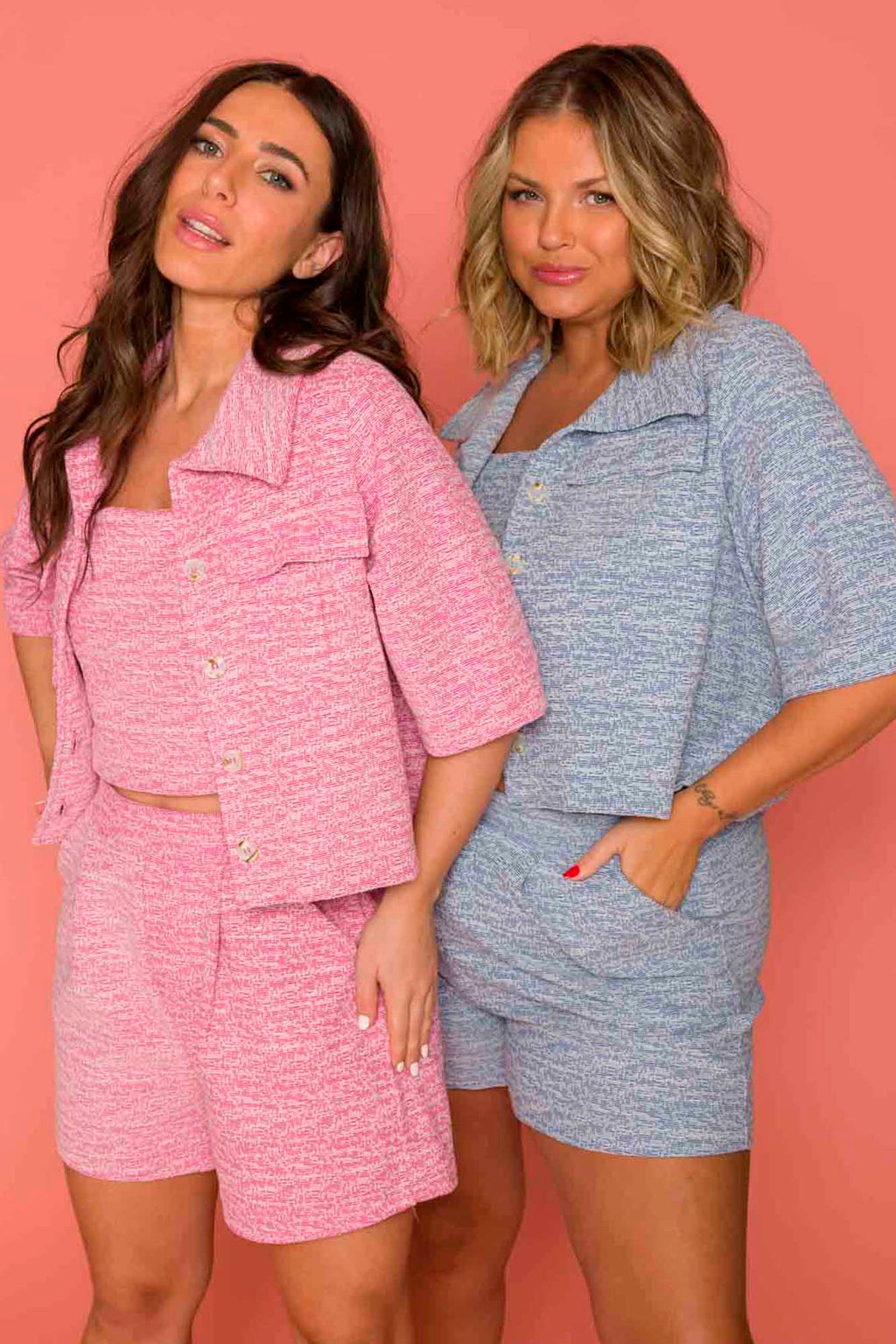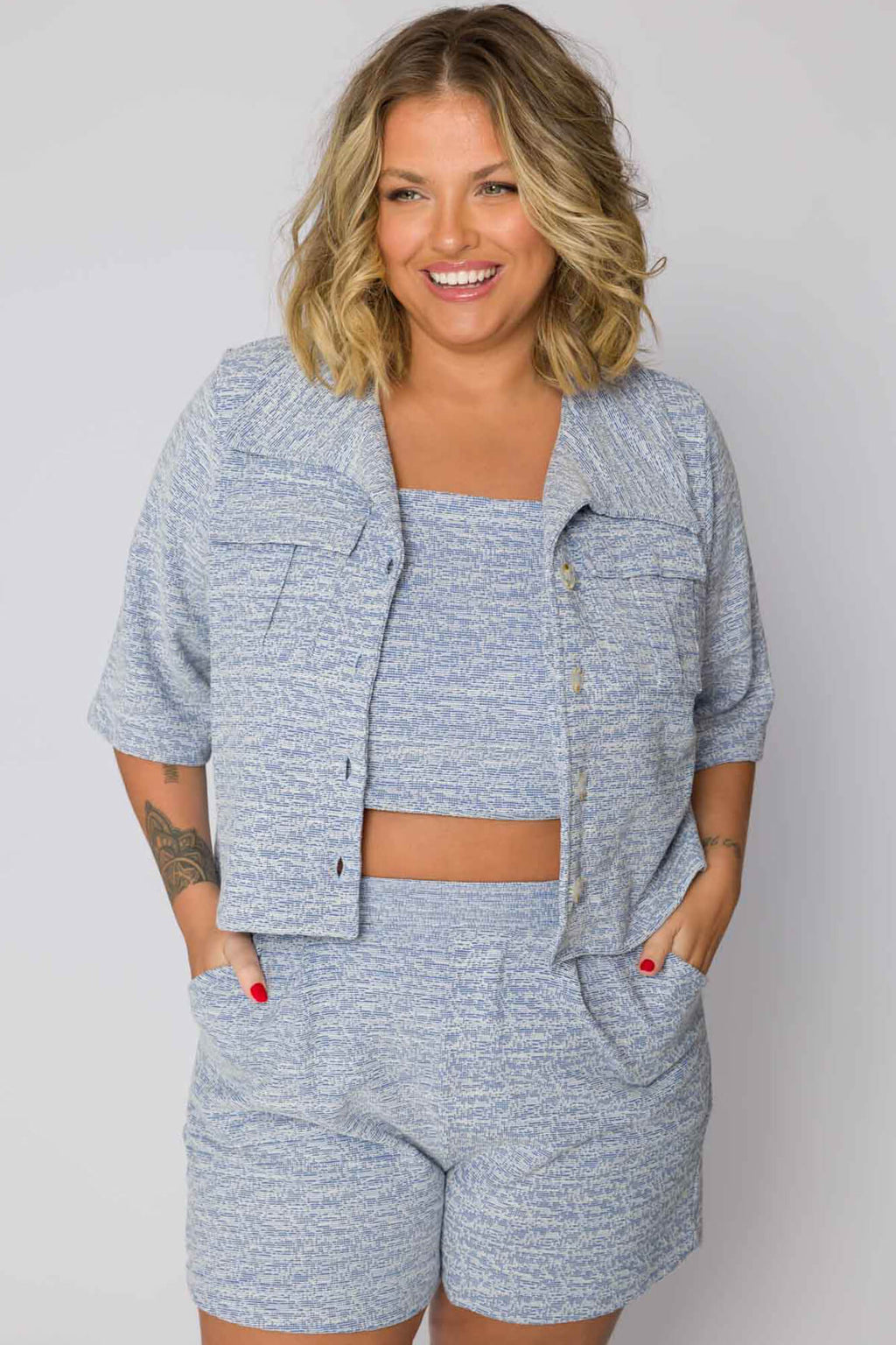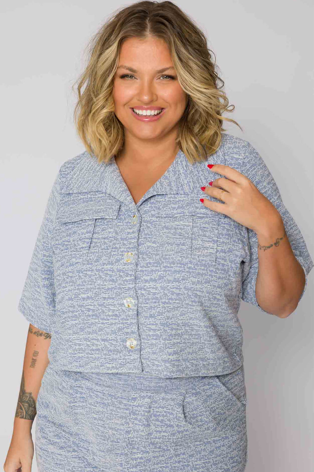 Com modelagem mais solta ao corpo, possui abertura frontal com botões, dois bolsos frontais com pregas e fechamento por lapela, gola polo e barra do cós e mangas mais larga valorizando o visual. Toda peça pespontada.