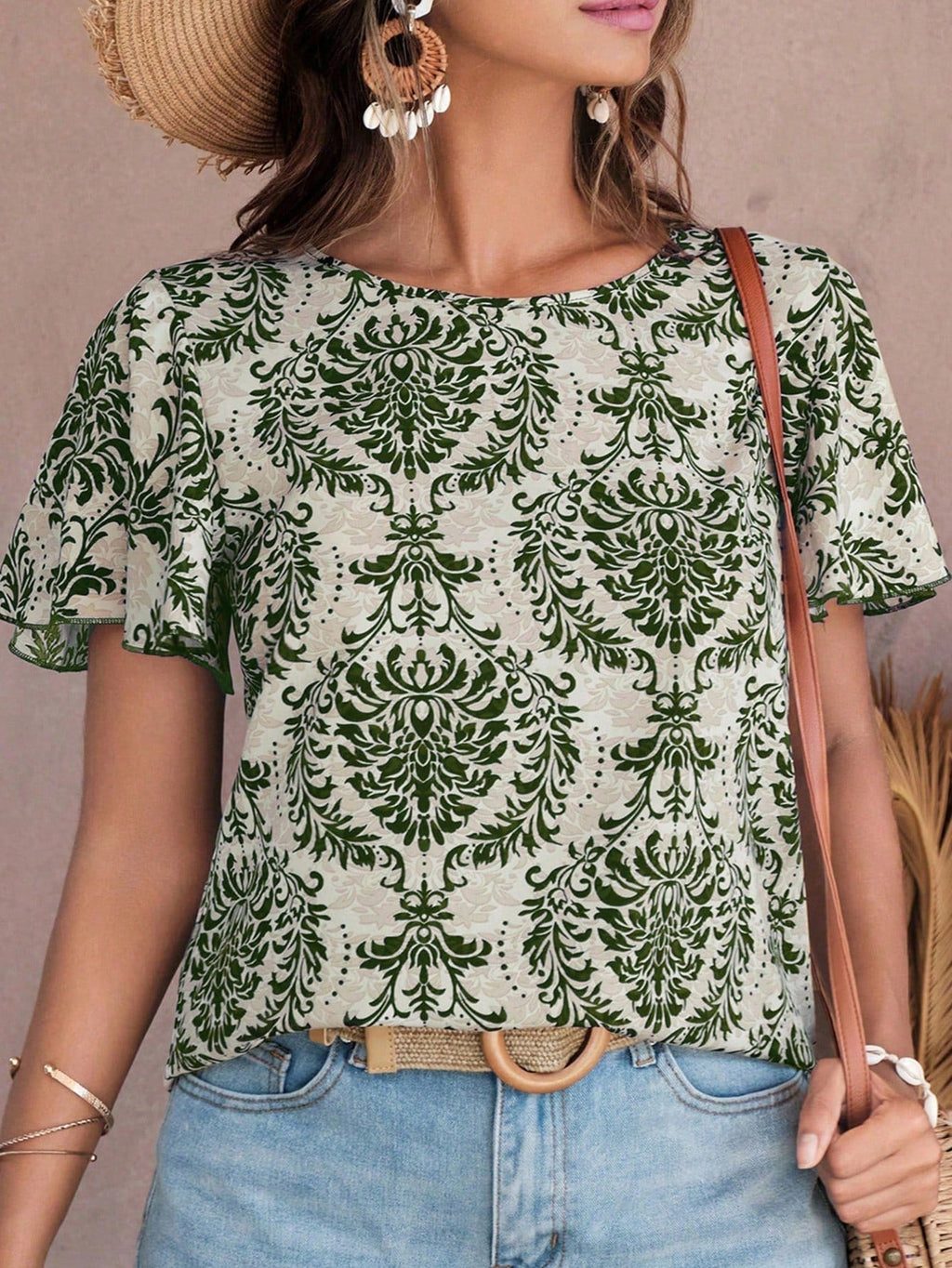 Estilo: Boho Tipo de manga: Manga esvoaçante Gola: Gola Redonda Tipo: Top Cor: Multicolorido Estampa: Bloco de cores Estampa: Floral Estampa: Estampa total Comprimento da Manga: Manga Curta Comprimento: Regular Caimento da peça: Ajuste Regular Tecido: Não elástico Material: Tecido Composição: 100% Poliéster Instruções de manutenção: Lavagem de máquina ou lavagem profissional a seco Translúcido: Não