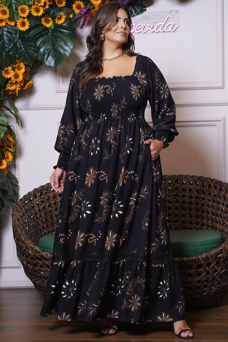Vestido Plus Sie Lastex Manga 7/8 Preto. Prepare-se para arrasar com nosso deslumbrante vestido! Confeccionado em viscose de alta qualidade, este vestido combina conforto excepcional com estilo impecável. Sua modelagem acinturada destaca suas curvas de forma elegante. Com sua parte superior em lastex, este vestido oferece um ajuste perfeito e flexível, adaptando-se confortavelmente ao seu corpo. Além disso, o elástico embutido nos ombros possibilita o uso ombro a ombro, adicionando um toque de versatilidade e charme ao seu visual. As mangas 7/8 com lastex adicionam um toque moderno ao visual, enquanto a saia forrada e os detalhes cuidadosamente trabalhados garantem conforto e sofisticação incomparáveis. Este é o vestido perfeito para qualquer ocasião, seja uma festa especial ou um encontro casual. Adquira o seu hoje e eleve seu estilo com confiança e elegância!