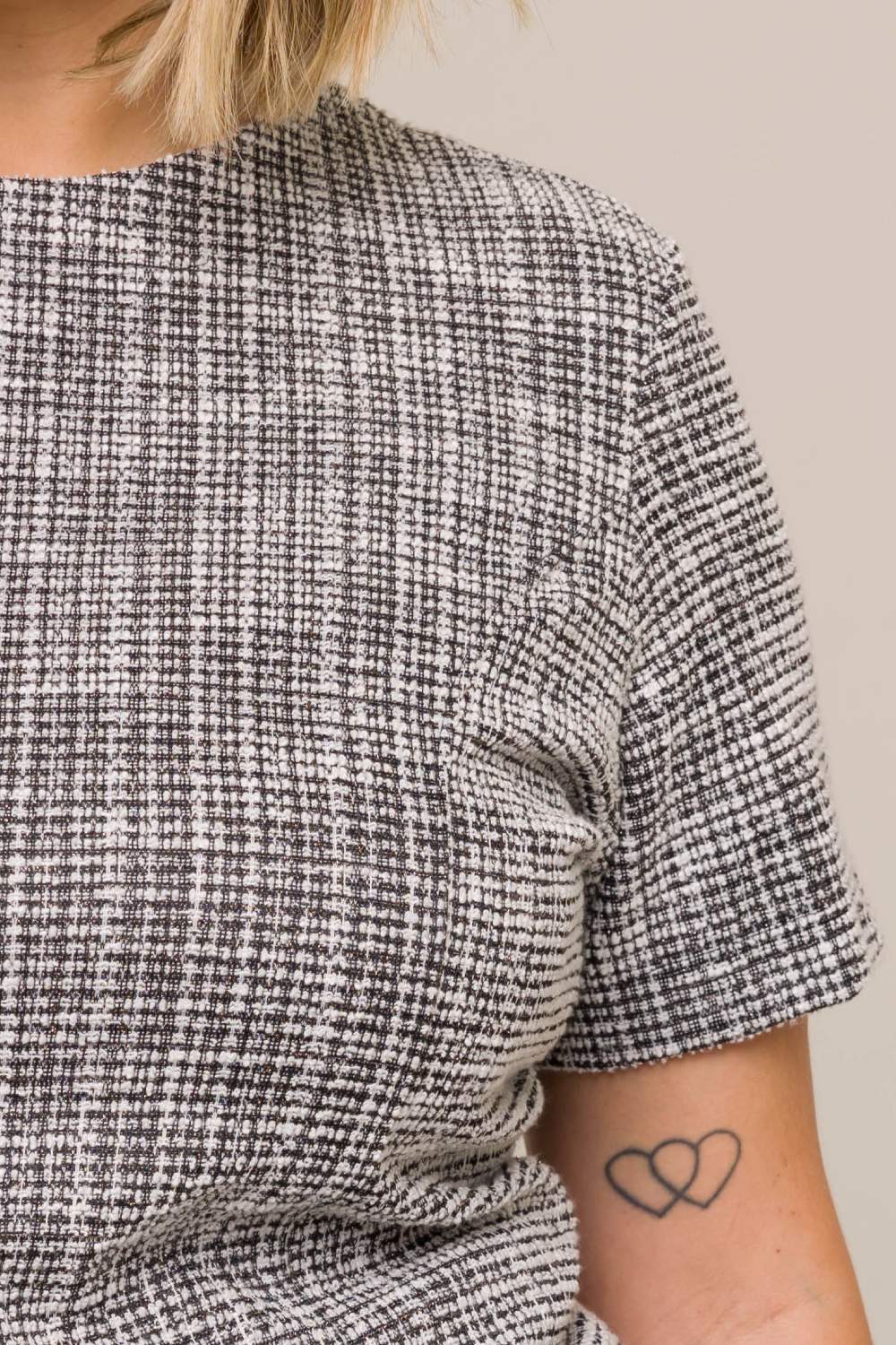 Tecido com Elasticidade: Em tweed com alta elasticidade e viscose em sua composição, oferece máximo conforto e liberdade de movimento, mantendo sempre um caimento elegante e ajustado ao corpo.